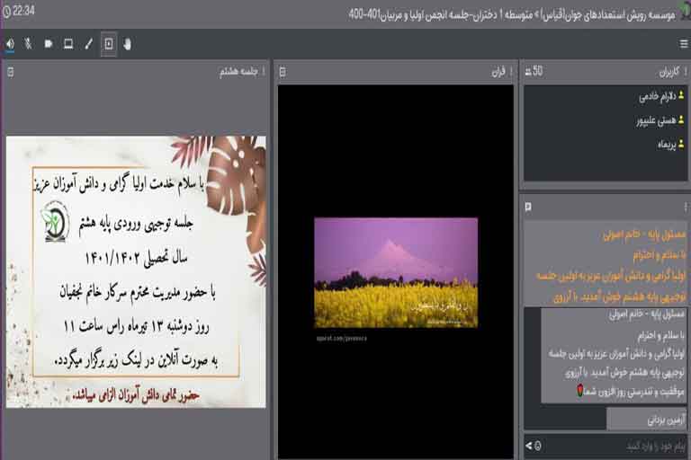 جلسه توجیهی کادر اجرایی با دانش آموزان پایه هشتم و پایه نهم پیرامون مسائل پایگاه تابستانی و سال تحصیلی ۱۴۰۲/۱۴۰۱ به صورت آنلاین در فضای اسکای روم برگزار شد.