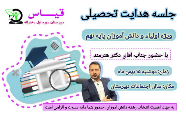 با هدف انتخاب رشته ای مناسب با استعداد و علاقه مندی و توانایی های دانش اموزان اقدام به برگزاری جلسه ای با حضور دکتر هنرمند شد.