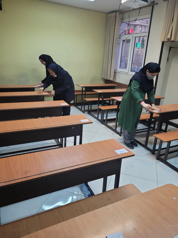 روز چهارشنبه 7 دی ماه پس از تعطیلی و خروج دانش اموزان از مدرسه ،کادر اجرایی جهت اماده سازی صندلی ها و شماره گذاری و اطلاعیه برای شروع ازمون های نوبت اول مشغول هماهنگی و برنامه ریزی بودند .
