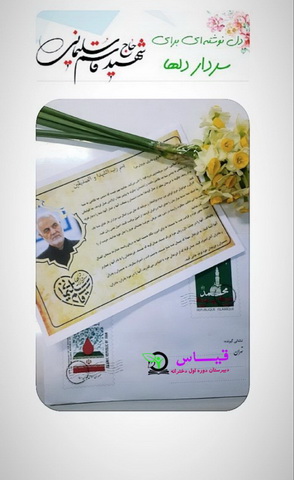پس از برگزاری مراسم یادبود سردار شهید حاج قاسم سلیمانی مسابقه ای با عنوان دلنوشته ای برای سردار دلها برگزار شد و دانش اموزان علاقه مند اثار خود را برای خانم خنجری معاون پرورشی مدرسه ارسال کردند.