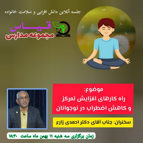 در روز سه شنبه عصر جلسه آنلاینی با موضوع دانش افزایی و سلامت خانواده و راهکارهای افزایش تمرکز و کاهش اضطراب با حضور جناب دکتر احمدی زارع برای مجموعه مدارس قیاس برگزار گردید.در این جلسه به پرسش های اولیای محترم پاسخ داده شد.