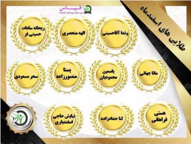 پس از تحویل کارنامه به اولیا اسامی ممتازین و نفرات برتر از طرف مسئولین پایه اعلام و تقدیر شد .