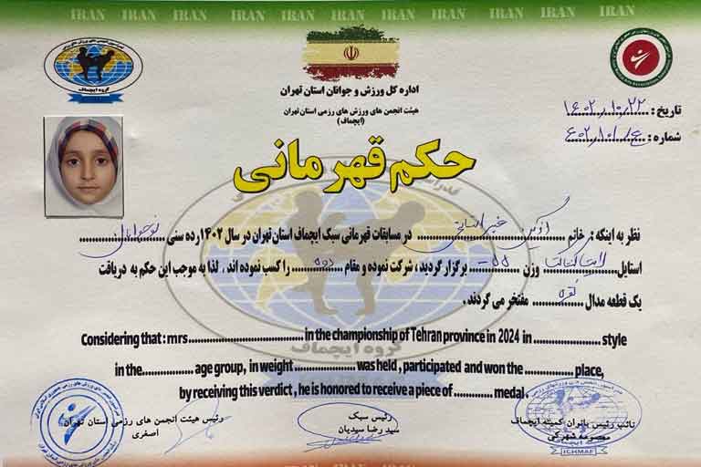کسب مقام دوم و برنده مدال نقره، افتخاری دیگر از دانش اموزان مدرسه قیاس در مسابقات قهرمانی سبک ایچماف استان تهران، سال ۱۴۰۲، رده سنی نوجوانان توسط دختر عزیزمان آذین عنبرستانی