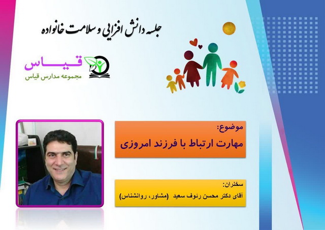 به همین منظور جلسه دانش افزایی به صورت آنلاین با موضوع مهارت ارتباط با فرزند امروزی با سخنرانی جناب آقای دکتر محسن رئوف سعید برگزار گردید..
